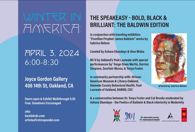 Winter in America: in conjunction with traveling exhibition “Frontline Prophet: James Baldwin” works by Sabrina Nelson Curated by Ashara Ekundayo & Omo Misha MC’d by Oakland’s Poet Laureate with special performances by’ Tongo Eisen Martin, Darrius Simpson, Zourhair Mussa, & Tonya Foster. —Courtesy of joycegordongallery